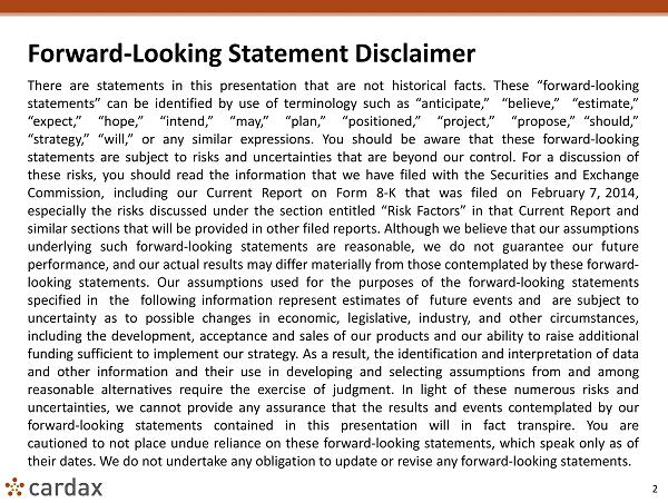 31 The information contained in this Corporate Presentation (this “Presentation”) summarizes certain information about Cardax, Inc . (the “Company”) and its subsidiary Cardax Pharma , Inc . and is qualified in its entirety by, and should be considered in conjunction with, the information (the “Company Public Disclosures”) that is filed by the Company from time to time with the Securities and Exchange Commission in accordance with the Securities and Exchange Act of 1934 , as amended . The Company Public Disclosures include filings or reports that include a summary of certain risks and uncertainties or “Risk Factors” . Because this Presentation does not include all of the material information, you should carefully review the Company Public Disclosures . This Presentation and the other information provided by the Company through its website or that may be accessed through the Company’s website is not part of the Company Public Disclosures unless it is filed with the Securities and Exchange Commission . This Presentation includes market and industry data and forecasts that we obtained from industry publications and surveys and other sources . Industry publications and surveys and forecasts generally state that the information contained therein has been obtained from sources believed to be reliable, but there can be no assurance as to the accuracy or completeness of such included information . We have not independently verified any of the data from third - party sources nor have we ascertained the underlying economic assumptions relied upon therein . Statements as to market position or consumer demand are based on data currently available to us . While we are not aware of any misstatements regarding our industry data presented herein, our estimates involve risks and uncertainties and are subject to change based on various factors . All registered trademarks, service marks, logos, images, and content are property of their respective owners and there is no endorsement of Cardax or any its products or technologies by any such owner . No offer of securities is made, or solicited, by the Company through this Presentation . The Company is not providing any legal, business, tax or other advice in this Presentation . No Governmental Agency or other authority has approved any aspect of the Company, its operations or its products and no Governmental Agency or other authority has approved or will approve the offering of any securities issued by the Company . Any representation to the contrary is unlawful . Certain Disclosures