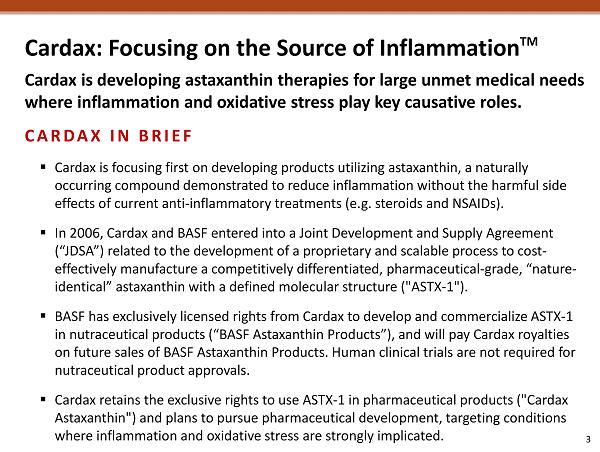 3 Cardax: Focusing on the Source of Inflammation TM Cardax is developing astaxanthin therapies for large unmet medical needs where inflammation and oxidative stress play key causative roles. CARDAX IN BRIEF ▪ Cardax is focusing first on developing products utilizing astaxanthin, a naturally occurring compound demonstrated to reduce inflammation without the harmful side effects of current anti - inflammatory treatments (e.g. steroids and NSAIDs). ▪ In 2006, Cardax and BASF entered into a Joint Development and Supply Agreement (“JDSA”) related to the development of a proprietary and scalable process to cost - effectively manufacture a competitively differentiated, pharmaceutical - grade, “nature - identical” astaxanthin with a defined molecular structure ("ASTX - 1"). ▪ BASF has exclusively licensed rights from Cardax to develop and commercialize ASTX - 1 in nutraceutical products (“BASF Astaxanthin Products”), and will pay Cardax royalties on future sales of BASF Astaxanthin Products. Human clinical trials are not required for nutraceutical product approvals. ▪ Cardax retains the exclusive rights to use ASTX - 1 in pharmaceutical products ("Cardax Astaxanthin") and plans to pursue pharmaceutical development, targeting conditions where inflammation and oxidative stress are strongly implicated.