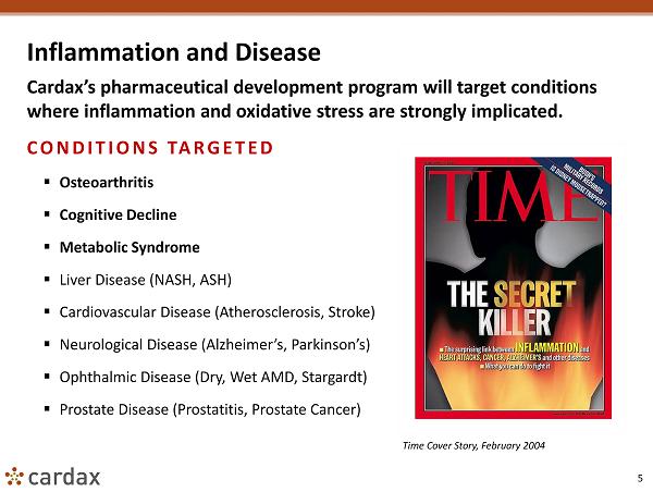 4 About Cardax Cardax oral anti - inflammatory products address underserved multi - billion dollar chronic disease markets. CORPORATE HIGHLIGHTS ▪ Cardax believes that the manufacturing advantages brought about by the JDSA will provide an efficient, scalable, and economical path to mass markets not available to low - volume agricultural astaxanthin producers. ▪ Major pharmaceutical opportunities may be pursued; Cardax plans to conduct human clinical trials in order to support nutraceutical marketing efforts as well as over - the - counter and/or prescription drug approval. ▪ Astaxanthin products are supported by extensive research including 1,000+ peer reviewed papers and 40+ human clinical trials. ▪ Cardax patents protect compositions of matter, pharmaceutical compositions, and pharmaceutical uses. ▪ Cardax management has strong operational and technical expertise in the field of astaxanthin manufacturing and science.