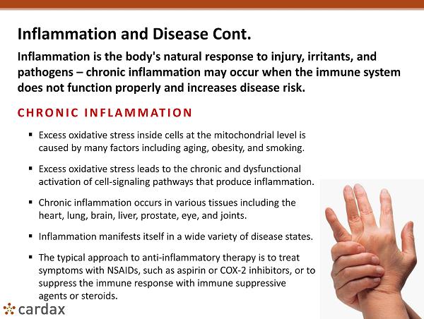 6 Inflammation and Disease Cont. Inflammation is the body's natural response to injury, irritants, and pathogens – chronic inflammation may occur when the immune system does not function properly and increases disease risk. CHRONIC INFLAMMATION ▪ Excess oxidative stress inside cells at the mitochondrial level is caused by many factors including aging, obesity, and smoking. ▪ Excess oxidative stress leads to the chronic and dysfunctional activation of cell - signaling pathways that produce inflammation. ▪ Chronic inflammation occurs in various tissues including the heart, lung, brain, liver, prostate, eye, and joints. ▪ Inflammation manifests itself in a wide variety of disease states. ▪ The typical approach to anti - inflammatory therapy is to treat symptoms with NSAIDs, such as aspirin or COX - 2 inhibitors, or to suppress the immune response with immune suppressive agents or steroids.