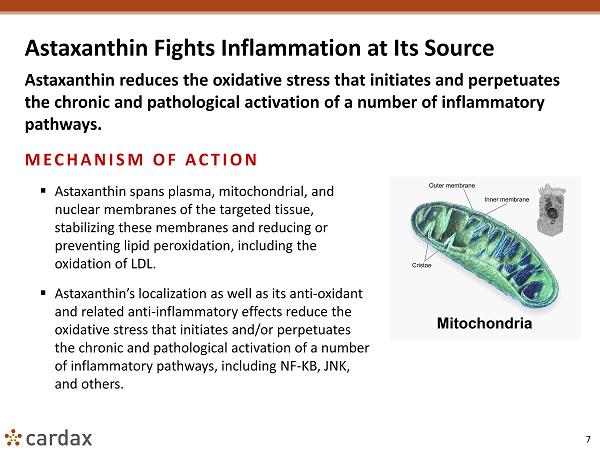 7 Astaxanthin Fights Inflammation at Its Source Astaxanthin reduces the oxidative stress that initiates and perpetuates the chronic and pathological activation of a number of inflammatory pathways. MECHANISM OF ACTION ▪ Astaxanthin spans plasma, mitochondrial, and nuclear membranes of the targeted tissue, stabilizing these membranes and reducing or preventing lipid peroxidation , including the oxidation of LDL. ▪ Astaxanthin’s localization as well as its anti - oxidant and related anti - inflammatory effects reduce the oxidative stress that initiates and/or perpetuates the chronic and pathological activation of a number of inflammatory pathways, including NF - KB, JNK, and others.