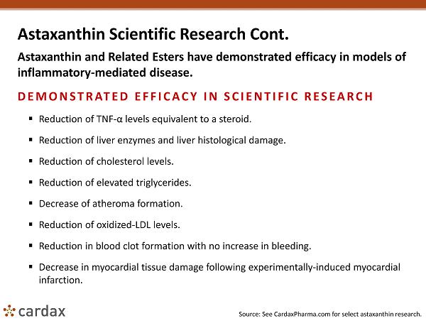Astaxanthin Scientific Research Cont. Astaxanthin and Related Esters have demonstrated efficacy in models of inflammatory - mediated disease. DEMONSTRATED EFFICACY IN SCIENTIFIC RESEARCH ▪ Reduction of TNF - α levels equivalent to a steroid. ▪ Reduction of liver enzymes and liver histological damage. ▪ Reduction of cholesterol levels. ▪ Reduction of elevated triglycerides. ▪ Decrease of atheroma formation. ▪ Reduction of oxidized - LDL levels. ▪ Reduction in blood clot formation with no increase in bleeding. ▪ Decrease in myocardial tissue damage following experimentally - induced myocardial infarction. Source: See CardaxPharma.com for select astaxanthin research.