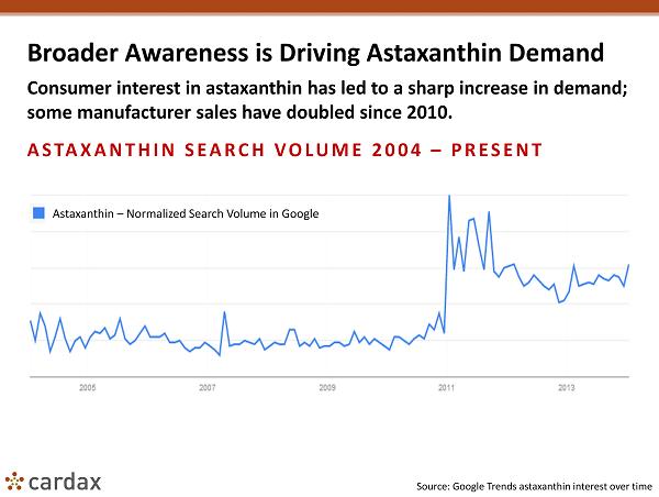 Broader Awareness is Driving Astaxanthin Demand Consumer interest in astaxanthin has led to a sharp increase in demand; some manufacturer sales have doubled since 2010. ASTAXANTHIN SEARCH VOLUME 2004 – PRESENT Source: Google Trends astaxanthin interest over time Astaxanthin – Normalized Search Volume in Google