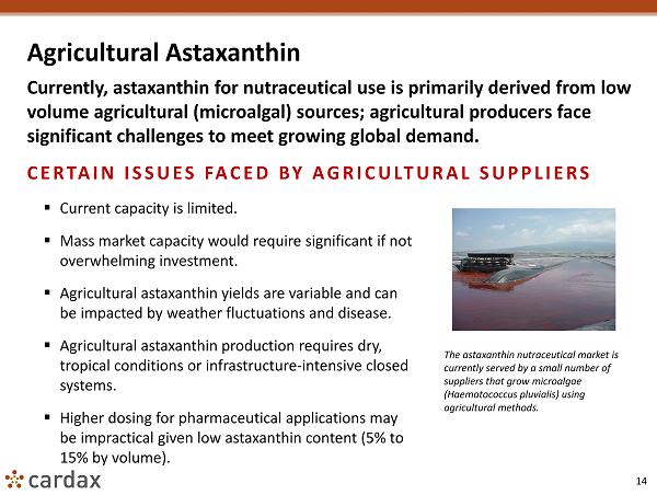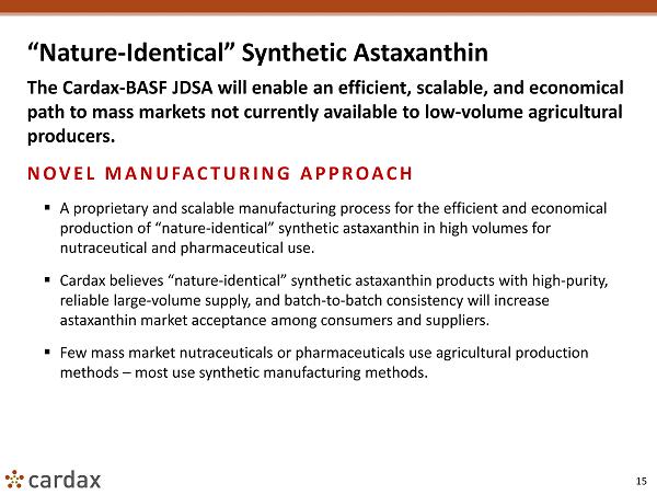 14 Agricultural Astaxanthin Currently, astaxanthin for nutraceutical use is primarily derived from low volume agricultural ( microalgal ) sources; agricultural producers face significant challenges to meet growing global demand. CERTAIN ISSUES FACED BY AGRICULTURAL SUPPLIERS The astaxanthin nutraceutical market is currently served by a small number of suppliers that grow microalgae ( Haematococcus pluvialis ) using agricultural methods. ▪ Current capacity is limited. ▪ Mass market capacity would require significant if not overwhelming investment. ▪ Agricultural astaxanthin yields are variable and can be impacted by weather fluctuations and disease. ▪ Agricultural astaxanthin production requires dry, tropical conditions or infrastructure - intensive closed systems. ▪ Higher dosing for pharmaceutical applications may be impractical given low astaxanthin content (5% to 15% by volume).
