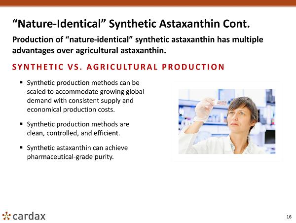 15 “Nature - Identical” Synthetic Astaxanthin The Cardax - BASF JDSA will enable an efficient, scalable, and economical path to mass markets not currently available to low - volume agricultural producers. NOVEL MANUFACTURING APPROACH ▪ A proprietary and scalable manufacturing process for the efficient and economical production of “nature - identical” synthetic astaxanthin in high volumes for nutraceutical and pharmaceutical use. ▪ Cardax believes “nature - identical” synthetic astaxanthin products with high - purity, reliable large - volume supply, and batch - to - batch consistency will increase astaxanthin market acceptance among consumers and suppliers. ▪ Few mass market nutraceuticals or pharmaceuticals use agricultural production methods – most use synthetic manufacturing methods.