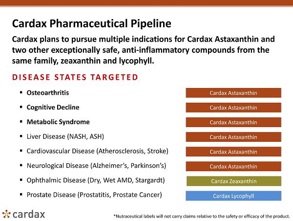 Cardax Pharmaceutical Pipeline Cardax plans to pursue multiple indications for Cardax Astaxanthin and two other exceptionally safe, anti - inflammatory compounds from the same family, zeaxanthin and lycophyll . DISEASE STATES TARGETED ▪ Osteoarthritis ▪ Cognitive Decline ▪ Metabolic Syndrome ▪ Liver Disease (NASH, ASH) ▪ Cardiovascular Disease (Atherosclerosis, Stroke) ▪ Neurological Disease (Alzheimer’s, Parkinson’s) ▪ Ophthalmic Disease (Dry, Wet AMD, Stargardt ) ▪ Prostate Disease ( Prostatitis , Prostate Cancer) Cardax Zeaxanthin Cardax Lycophyll Cardax Astaxanthin Cardax Astaxanthin Cardax Astaxanthin Cardax Astaxanthin Cardax Astaxanthin Cardax Astaxanthin *Nutraceutical labels will not carry claims relative to the safety or efficacy of the product.