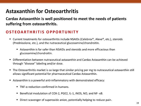 Astaxanthin for Osteoarthritis Cont. The Centers for Disease Control and Prevention report that the amount of direct medical expenditures in the U.S. for arthritis and other rheumatic conditions was $80.8B in 2003. OSTEOARTHRITIS MARKET OVERVIEW ▪ According to the Centers for Disease Control and Prevention, one in every five American adults have doctor - diagnosed arthritis. As the country's population ages, it is estimated that this number will increase to at least 67% by 2030. ▪ Aggregate U.S. sales of the top three injected TNF - α inhibitors totaled more than $12B in 2012. ▪ Cardax estimates that there are more than 150 million people in developed nations that suffer from osteoarthritis who have the financial ability to pay for Cardax Astaxanthin treatments. Sources: CDC.gov; Drugs.com.