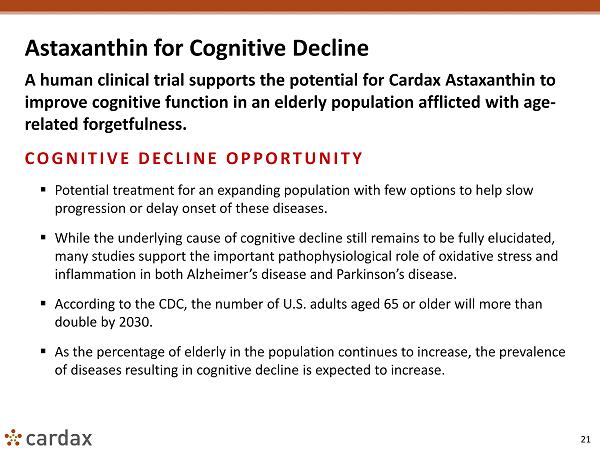 21 Astaxanthin for Cognitive Decline A human clinical trial supports the potential for Cardax Astaxanthin to improve cognitive function in an elderly population afflicted with age - related forgetfulness. COGNITIVE DECLINE OPPORTUNITY ▪ Potential treatment for an expanding population with few options to help slow progression or delay onset of these diseases. ▪ While the underlying cause of cognitive decline still remains to be fully elucidated, many studies support the important pathophysiological role of oxidative stress and inflammation in both Alzheimer’s disease and Parkinson’s disease. ▪ According to the CDC, the number of U.S. adults aged 65 or older will more than double by 2030. ▪ As the percentage of elderly in the population continues to increase, the prevalence of diseases resulting in cognitive decline is expected to increase.