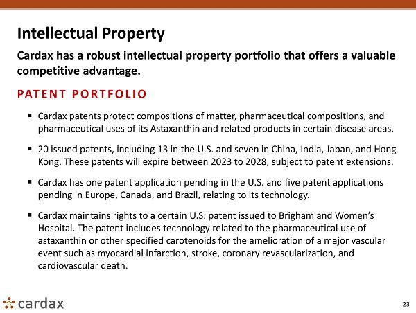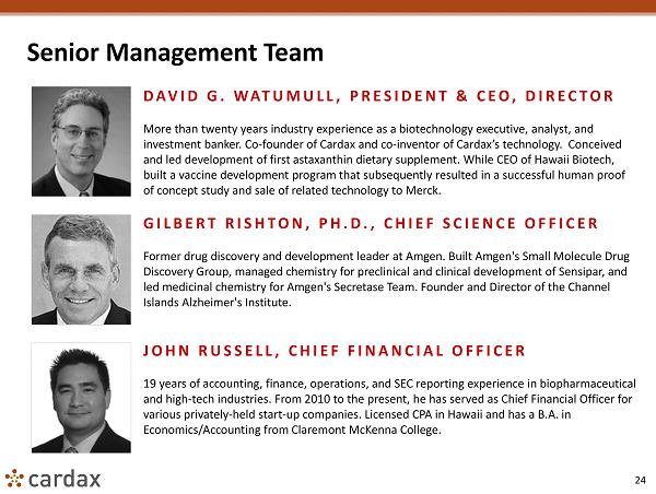 23 Intellectual Property Cardax has a robust intellectual property portfolio that offers a valuable competitive advantage. PATENT PORTFOLIO ▪ Cardax patents protect compositions of matter, pharmaceutical compositions, and pharmaceutical uses of its Astaxanthin and related products in certain disease areas. ▪ 20 issued patents, including 13 in the U.S. and seven in China, India, Japan, and Hong Kong. These patents will expire between 2023 to 2028, subject to patent extensions. ▪ Cardax has one patent application pending in the U.S. and five patent applications pending in Europe, Canada, and Brazil, relating to its technology. ▪ Cardax maintains rights to a certain U.S. patent issued to Brigham and Women’s Hospital. The patent includes technology related to the pharmaceutical use of astaxanthin or other specified carotenoids for the amelioration of a major vascular event such as myocardial infarction, stroke, coronary revascularization, and cardiovascular death.