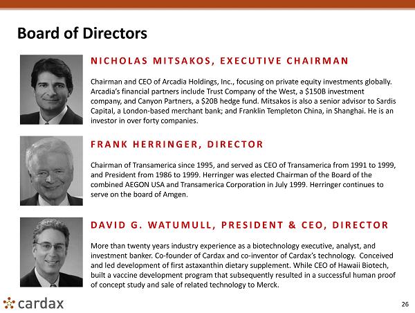 25 Senior Management Team Cont. TIMOTHY KING, PH.D., VP RESEARCH Former Staff Scientist at the Fred Hutchinson Cancer Research Center (FHCRC) in Seattle, Washington, Dr. King has over 22 years of combined academic and private sector scientific research experience including utilizing cell culture and animal model systems to address a wide range of topics including cardiovascular disease, liver disease, thrombosis, and cancer. DAVID M. WATUMULL, VP OPERATIONS Over ten years experience in biotechnology with Hawaii Biotech and Cardax Pharmaceuticals. Has day - to - day responsibility for the Company’s operations as well as relations with partners and contractors for the production and testing of Cardax compounds. Manages the Cardax intellectual property portfolio.