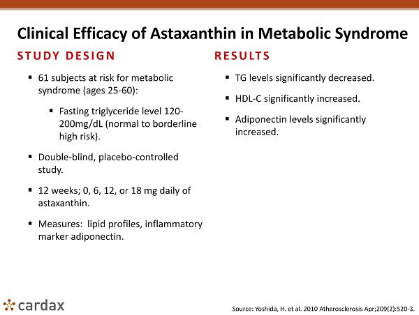 Clinical Efficacy of Astaxanthin in Metabolic Syndrome STUDY DESIGN ▪ 61 subjects at risk for metabolic syndrome (ages 25 - 60): ▪ Fasting triglyceride level 120 - 200mg/ dL (normal to borderline high risk). ▪ Double - blind, placebo - controlled study. ▪ 12 weeks; 0, 6, 12, or 18 mg daily of astaxanthin. ▪ Measures: lipid profiles, inflammatory marker adiponectin . RESULTS ▪ TG levels significantly decreased. ▪ HDL - C significantly increased. ▪ Adiponectin levels significantly increased. Source: Yoshida, H. et al. 2010 Atherosclerosis Apr;209(2):520 - 3.
