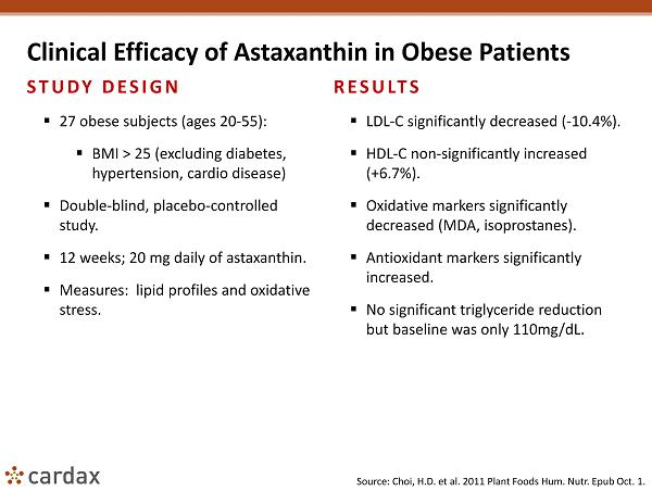 Clinical Efficacy of Astaxanthin in Obese Patients STUDY DESIGN ▪ 27 obese subjects (ages 20 - 55): ▪ BMI > 25 (excluding diabetes, hypertension, cardio disease) ▪ Double - blind, placebo - controlled study. ▪ 12 weeks; 20 mg daily of astaxanthin. ▪ Measures: lipid profiles and oxidative stress. RESULTS ▪ LDL - C significantly decreased ( - 10.4%). ▪ HDL - C non - significantly increased (+6.7%). ▪ Oxidative markers significantly decreased (MDA, isoprostanes ). ▪ Antioxidant markers significantly increased. ▪ No significant triglyceride reduction but baseline was only 110mg/ dL . Source: Choi , H.D. et al. 2011 Plant Foods Hum. Nutr . Epub Oct. 1.